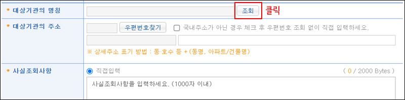 5. 이제 대상기관을 입력합니다. 먼저 대상기관 명칭 탭에 '조회' 버튼을 클릭합니다.