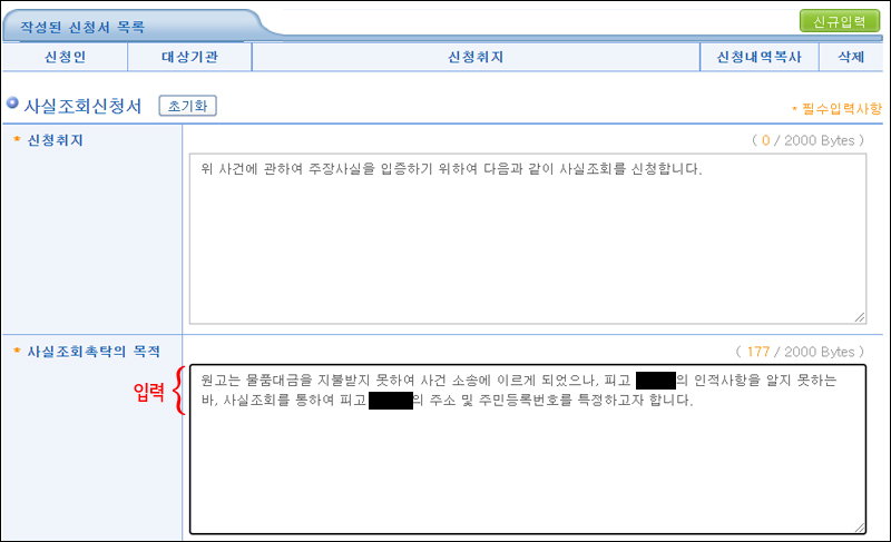 * 전자소송 사이트에서 사실조회 신청서 작성 방법