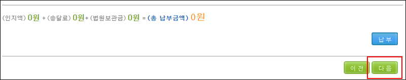 8. 그다음 인지액, 송달료, 법원보관금 등을 납부하는 순서입니다. 사실조회 신청을 통신사 3사로 할 경우, 납부할 금액이 없습니다. 금융기관의 경우 2,000원 정도 소요되는 것으로 알고 있는데 이 역시 사실조회회신이 올 때 납부해도 되기 때문에 '다음' 버튼을 눌러 넘어갑니다.