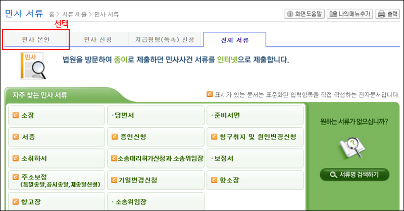 3-1. 나타난 화면에서 '민사 본안' 탭을 선택합니다.