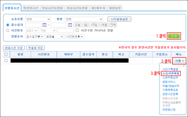 2. '조회' 버튼을 눌러 진행 중인 사건을 불러옵니다. 그중 사실조회 신청을 하고자 하는 사건의 '이동' 버튼을 누르고, '소송서류제출' 메뉴를 클릭합니다.