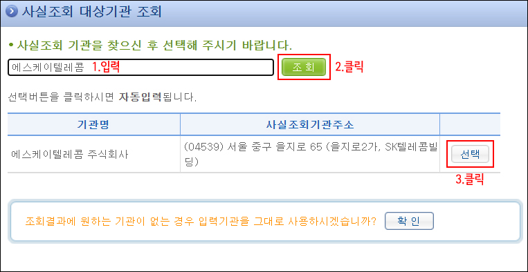 5-1. 팝업창이 뜨는데, 조회 기관의 명칭을 입력합니다. 조회 기관 명칭은 한글로 입력해야 합니다. 통신사 3사의 경우, 에스케이텔레콤 주식회사 / 주식회사 케이티 / 주식회사 엘지유플러스로 입력하면 나옵니다:-) 해당 기관을 선택하면 자동으로 기관 주소까지 입력됩니다.