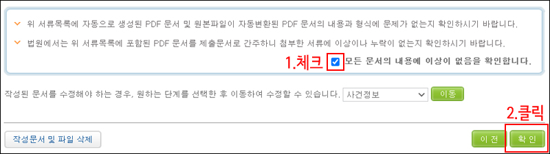 7. PDF 형식으로 변환된 내용을 다시 한번 확인하고, '모든 문서의 내용에 이상이 없음을 확인합니다.'에 체크 후, '확인' 버튼을 누릅니다.