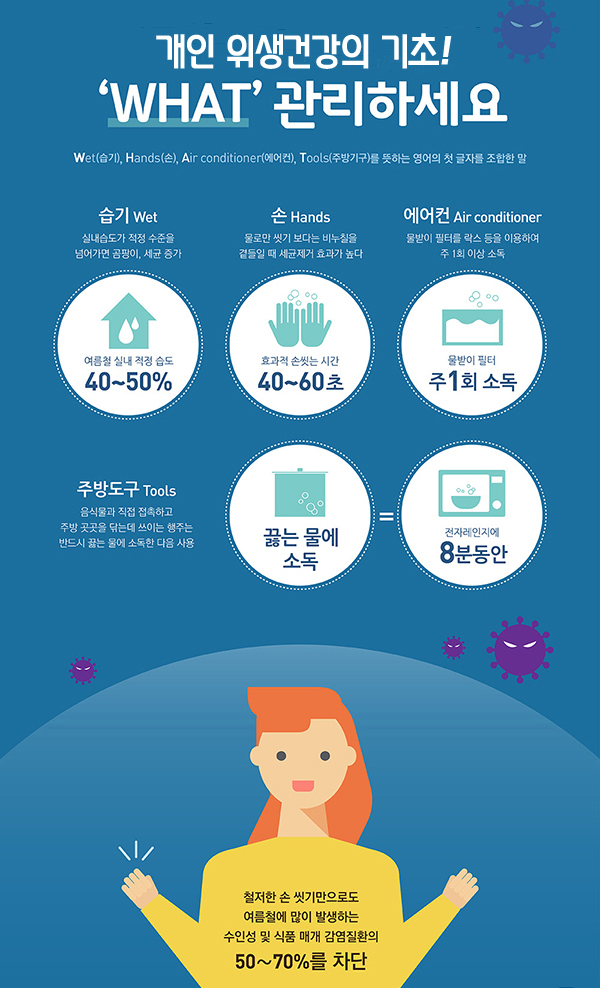 W.H.A.T는 세균 감염의 매개체를 뜻하는 약자인 W(Wet 습기).H(Hands 손).A(Air-conditioned 에어컨).T(Tools 주방도구)인데, 이 4가지만 주의해도 기본적인 세균,바이러스를 예방할 수 있다고 합니다.